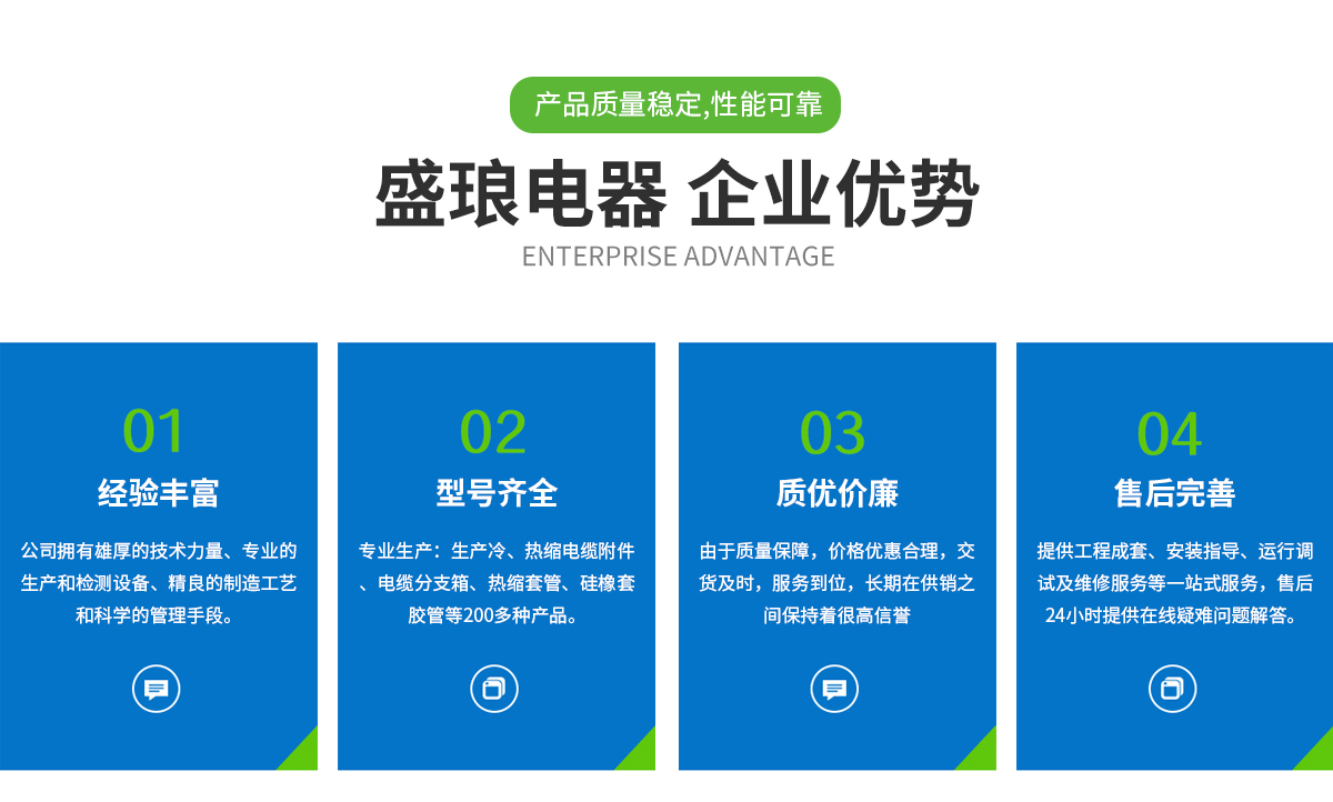 盛瑯電器是淮南市一家生產電力環保新型產品的制造型企業。目前擁有職工183名,其中工程師及技術人員占職工總人數的31%以上,優良的技術團隊,具有強大的研發能力。公司選用國內質優智能品牌設備85臺,采用進口新型環保材料。主要生產冷、熱縮電纜附件、插拔件、冷熱縮.....